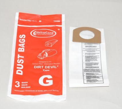 Introducing the Dirt Devil G bags, specially designed for your Dirt Devil handvac, ensuring optimal performance and efficiency. Manufactured by Envirocare, these high-quality bags are crafted to effectively capture dirt and debris, making your cleaning routine easier and more effective. With a precise fit for your handvac model, you can rely on these bags to help maintain the cleanliness of your home while also protecting your vacuum's motor. Upgrade your cleaning experience with the reliability and performance of Dirt Devil G bags by Envirocare!